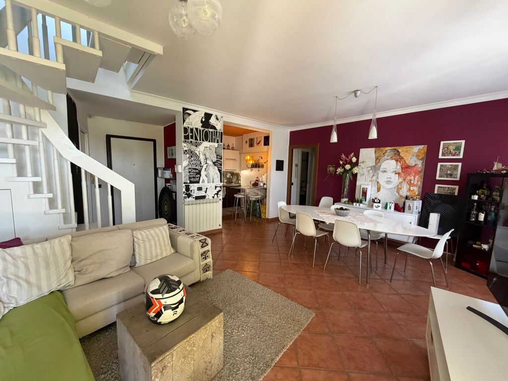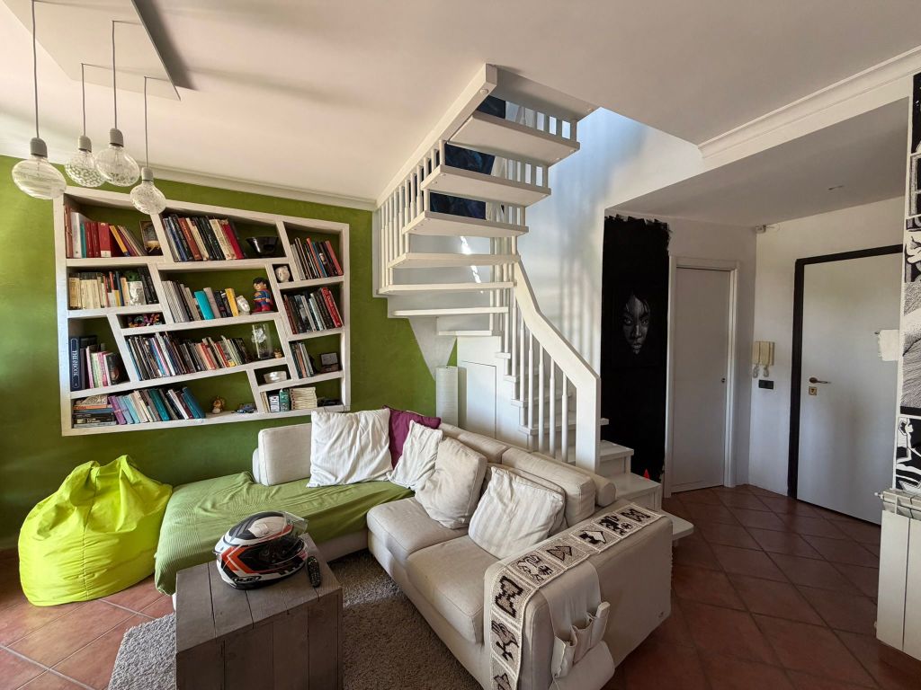 • Primo livello: ampio e luminoso salone doppio con cucina a vista, bagno e pratico ripostiglio. Da qui si accede a uno splendido terrazzo vivibile con affaccio sul verde e sulla piazza principale del comprensorio.